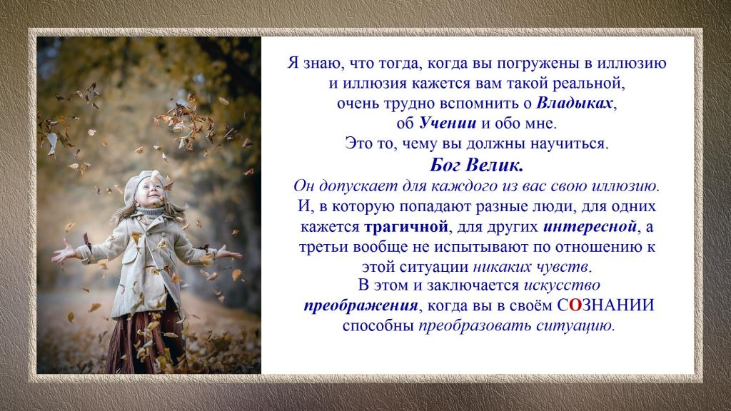Я знаю, что тогда, когда вы погружены в иллюзию и иллюзия кажется вам такой реальной, очень трудно вспомнить о Владыках, об Учении и обо мне.