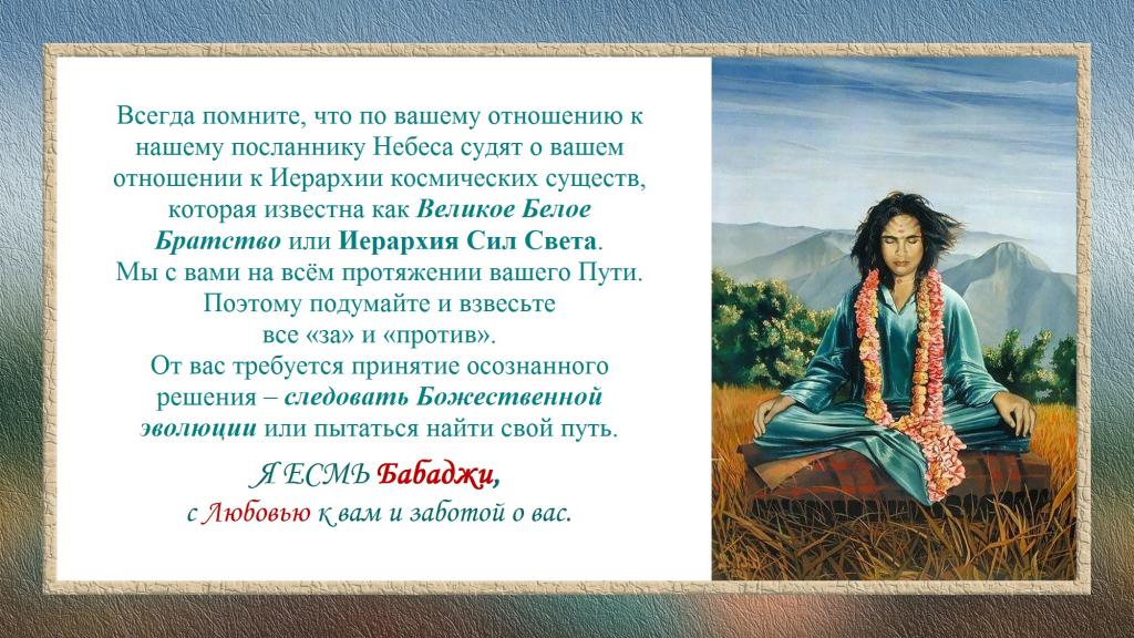 Всегда помните, что по вашему отношению к нашему посланнику Небеса судят о вашем отношении к Иерархии космических существ, которая известна как Великое Белое Братство или Иерархия Сил Света.