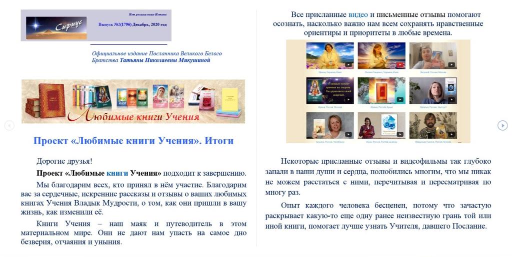 Проект Т.Н. Микушиной «Любимые книги Учения» закончился в декабре 2020 года (смотри выпуск №2 (1796) декабрь 2020года) ...