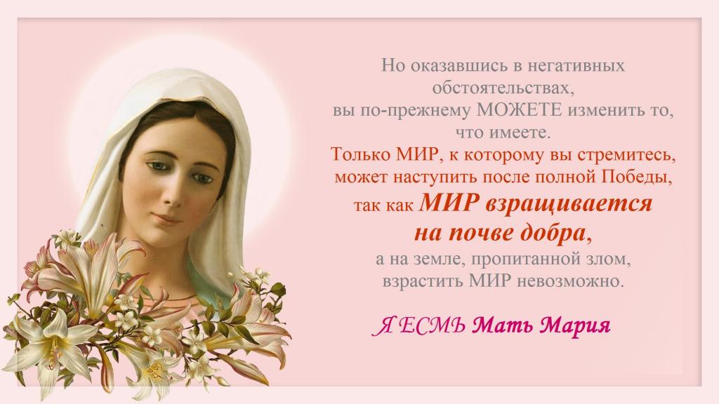 Только МИР, к которому вы стремитесь, может наступить после полной Победы, так как МИР взращивается на почве добра, а на земле, пропитанной злом, взрастить МИР невозможно.