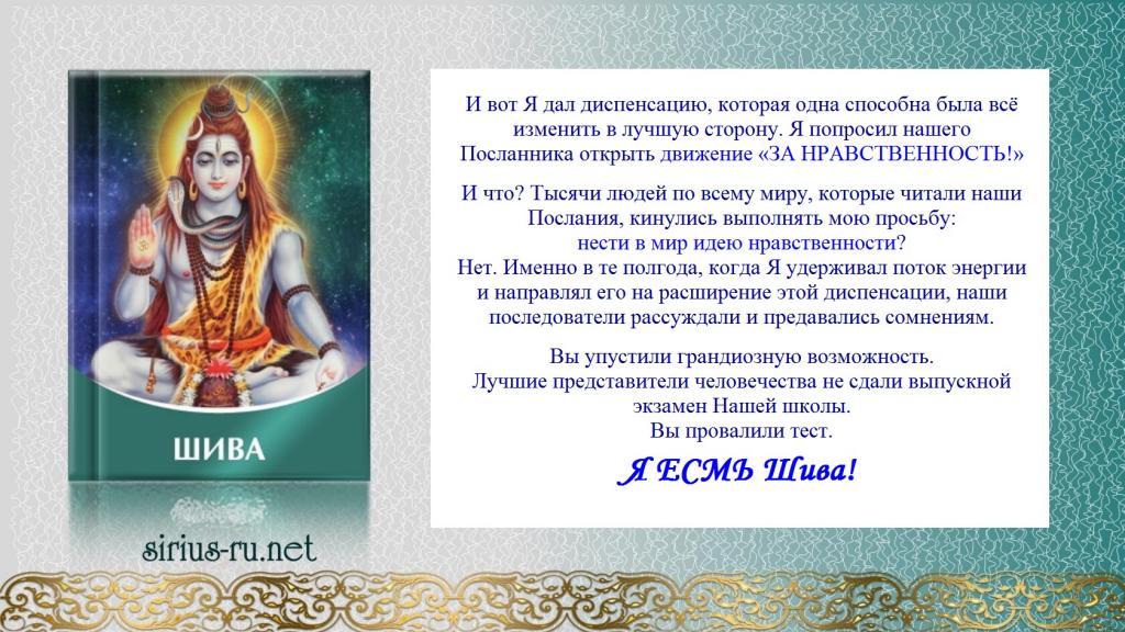 И вот Я дал диспенсацию, которая одна способна была всё изменить в лучшую сторону. Я попросил нашего Посланника открыть движение «ЗА НРАВСТВЕННОСТЬ!»