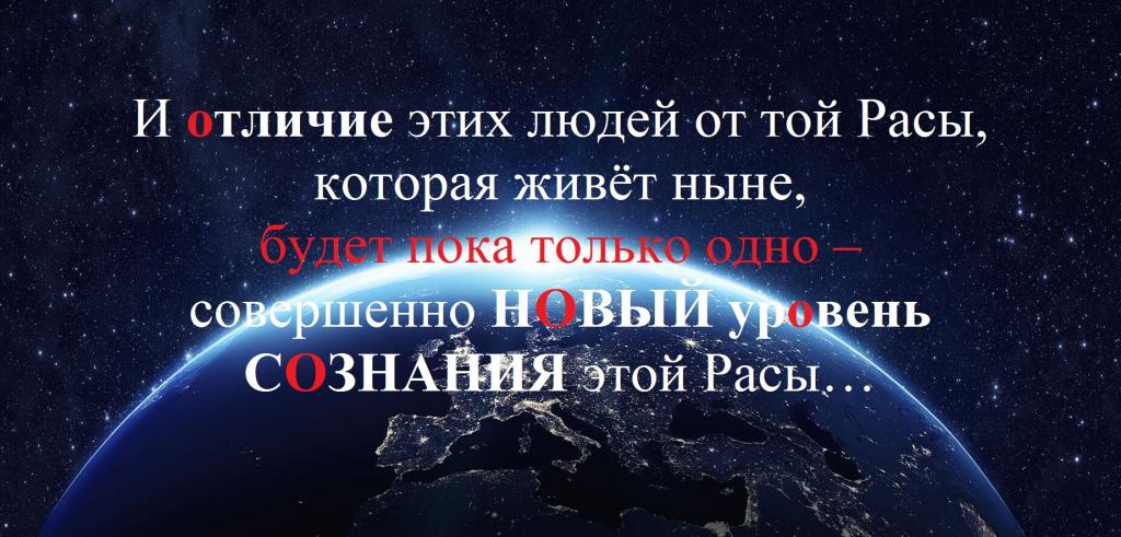 И отличие этих людей от той Расы, которая живёт ныне, будет пока только одно – совершенно НОВЫЙ уровень СОЗНАНИЯ этой Расы и неприемлемость для этой Расы любого чувства борьбы и насилия.