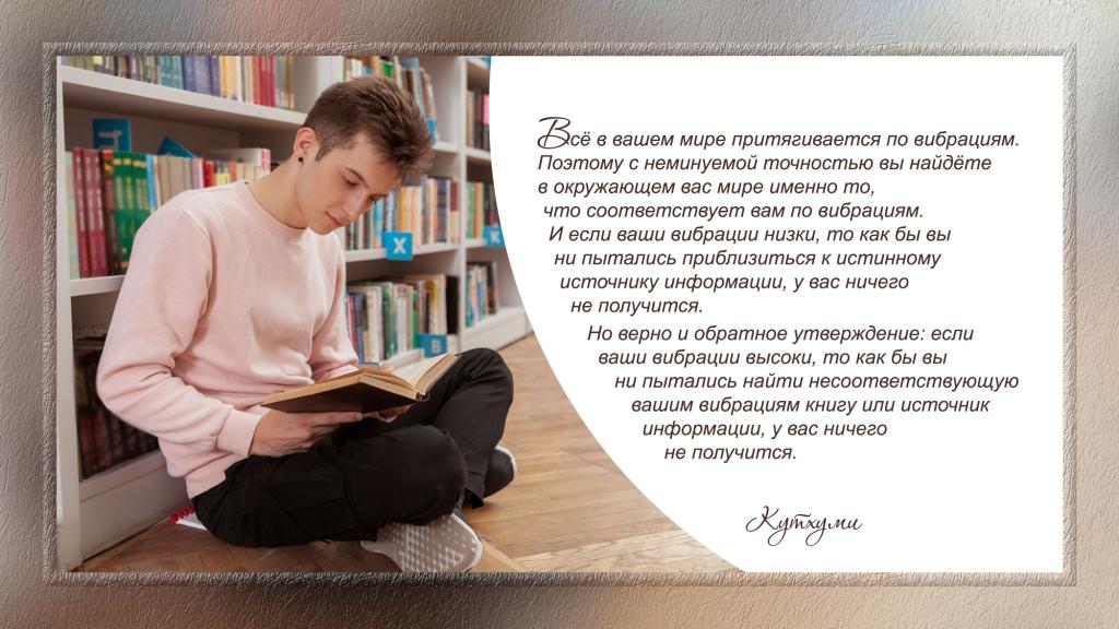 Но верно и обратное утверждение: если ваши вибрации высоки, то как бы вы ни пытались найти несоответствующую вашим вибрациям книгу или источник информации, у вас ничего не получится.