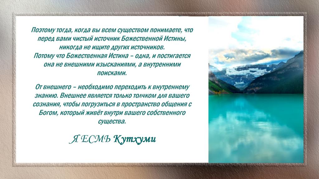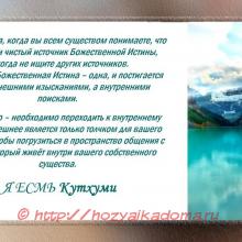 Поэтому тогда, когда вы всем существом понимаете, что перед вами чистый источник Божественной Истины, никогда не ищите других источников. Потому что Божественная Истина – одна, и постигается она не внешними изысканиями, а внутренними поисками.