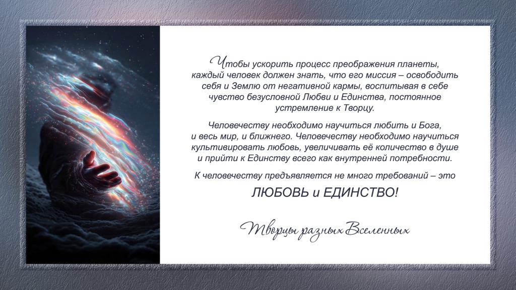 К человечеству предъявляется не много требований – это ЛЮБОВЬ и ЕДИНСТВО!