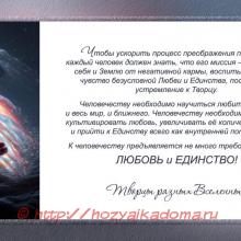 Чтобы ускорить процесс преображения планеты, каждый человек должен знать, что его миссия – освободить себя и Землю от негативной кармы, воспитывая в себе чувство безусловной Любви и Единства, постоянное устремление к Творцу.