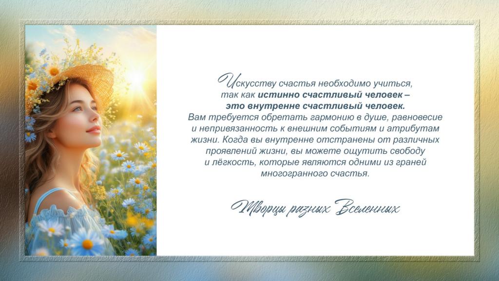 Искусству счастья необходимо учиться, так как истинно счастливый человек – это внутренне счастливый человек. Вам требуется обретать гармонию в душе, равновесие и непривязанность к внешним событиям и атрибутам жизни. Когда вы внутренне отстранены от различных проявлений жизни, вы можете ощутить свободу и лёгкость, которые являются одними из граней многогранного счастья.