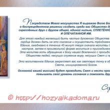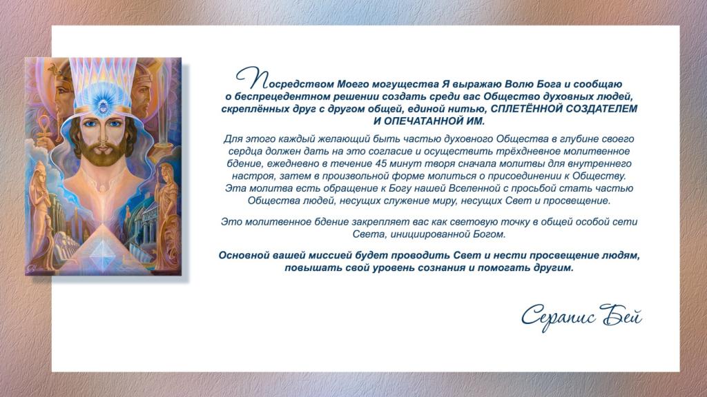 Посредством Моего могущества Я выражаю Волю Бога и сообщаю о беспрецедентном решении создать среди вас Общество духовных людей, скреплённых друг с другом общей, единой нитью, СПЛЕТЁННОЙ СОЗДАТЕЛЕМ И ОПЕЧАТАННОЙ ИМ.