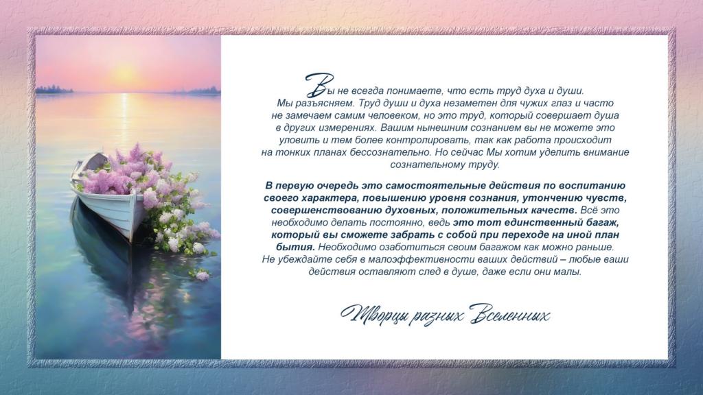 Вы не всегда понимаете, что есть труд духа и души. Мы разъясняем. Труд души и духа незаметен для чужих глаз и часто не замечаем самим человеком, но это труд, который совершает душа в других измерениях. Вашим нынешним сознанием вы не можете это уловить и тем более контролировать, так как работа происходит на тонких планах бессознательно. Но сейчас Мы хотим уделить внимание сознательному труду.