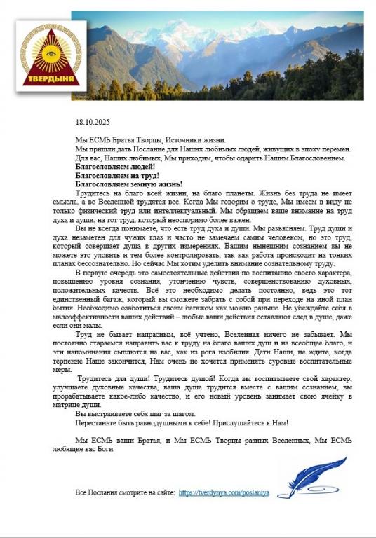 Труд не бывает напрасным, всё учтено, Вселенная ничего не забывает. Мы постоянно стараемся направить вас к труду на благо ваших душ и на всеобщее благо, и эти напоминания сыплются на вас, как из рога изобилия. Дети Наши, не ждите, когда терпение Наше закончится, Нам очень не хочется применять суровые воспитательные меры.