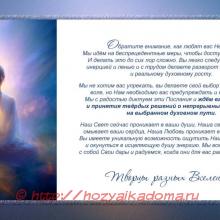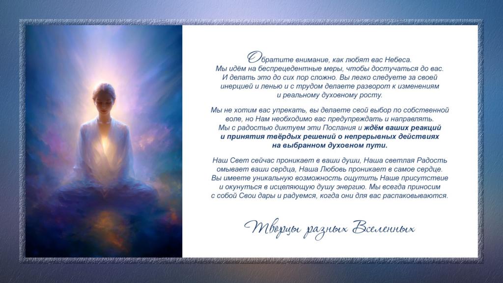 Мы не хотим вас упрекать, вы делаете свой выбор по собственной воле, но Нам необходимо вас предупреждать и направлять. Мы с радостью диктуем эти Послания и ждём ваших реакций и принятия твёрдых решений о непрерывных действиях на выбранном духовном пути.