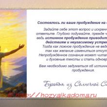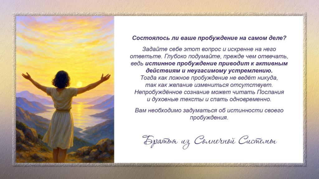 Задайте себе этот вопрос и искренне на него ответьте. Глубоко подумайте, прежде чем отвечать, ведь истинное пробуждение приводит к активным действиям и неугасимому устремлению. Тогда как ложное пробуждение не ведёт никуда, так как желание измениться отсутствует. Непробуждённое сознание может читать Послания и духовные тексты и спать одновременно.