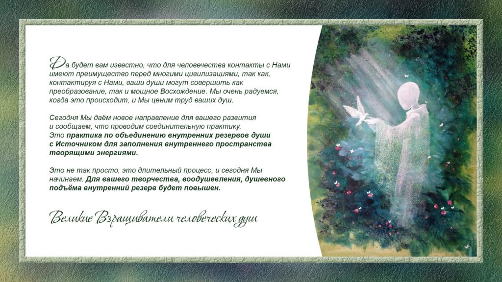 Сегодня Мы даём новое направление для вашего развития и сообщаем, что проводим соединительную практику. Это практика по объединению внутренних резервов души с Источником для заполнения внутреннего пространства творящими энергиями.