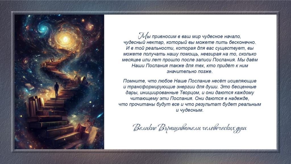 Мы привносим в ваш мир чудесное начало, чудесный нектар, который вы можете пить бесконечно. И в той реальности, которая для вас существует, вы можете получать нашу помощь, невзирая на то, сколько месяцев или лет прошло после записи Послания. Мы даём Наши Послания также для тех, кто придёт к ним значительно позже.