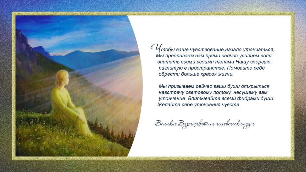 Вы ещё не научились испытывать такую гамму чувств с таким количеством оттенков, поэтому Нам хочется поделиться с вами хоть немного, если вы сможете уловить эти ароматы. Концентрация Наших чувств в этом Послании затронет вашу сердечную чакру, и приятное ощущение разбежится по телу.