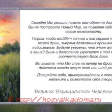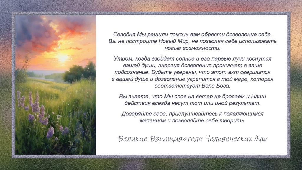 Утром, когда взойдёт солнце и его первые лучи коснутся вашей души, энергия дозволения проникнет в ваше подсознание. Будьте уверены, что этот акт свершится в вашей душе и дозволение укрепится в той мере, которая соответствует Воле Бога.