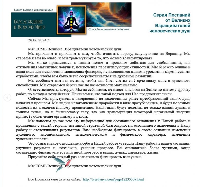 Мы доносим до вас всю эту информацию для осознанного отношения к Нашей работе и проявления с вашей стороны истинной сердечной благодарности, осознанного включения в Нашу работу и отслеживания результатов. Вам необходимо фиксировать в своём сознании изменения духовного, эмоционального, психологического и физического характера, изменение чувствительности.