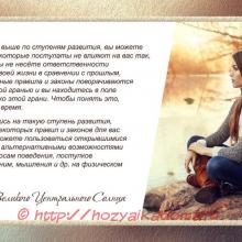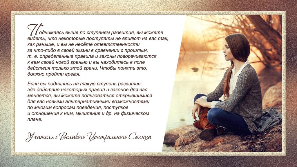 Поднимаясь выше по ступеням развития, вы можете видеть, что некоторые постулаты не влияют на вас так, как раньше, и вы не несёте ответственности за что-либо в своей жизни в сравнении с прошлым, т. е. определённые правила и законы поворачивается к вам своей новой гранью и вы находитесь в поле действия только этой грани. Чтобы понять это, должно пройти время.