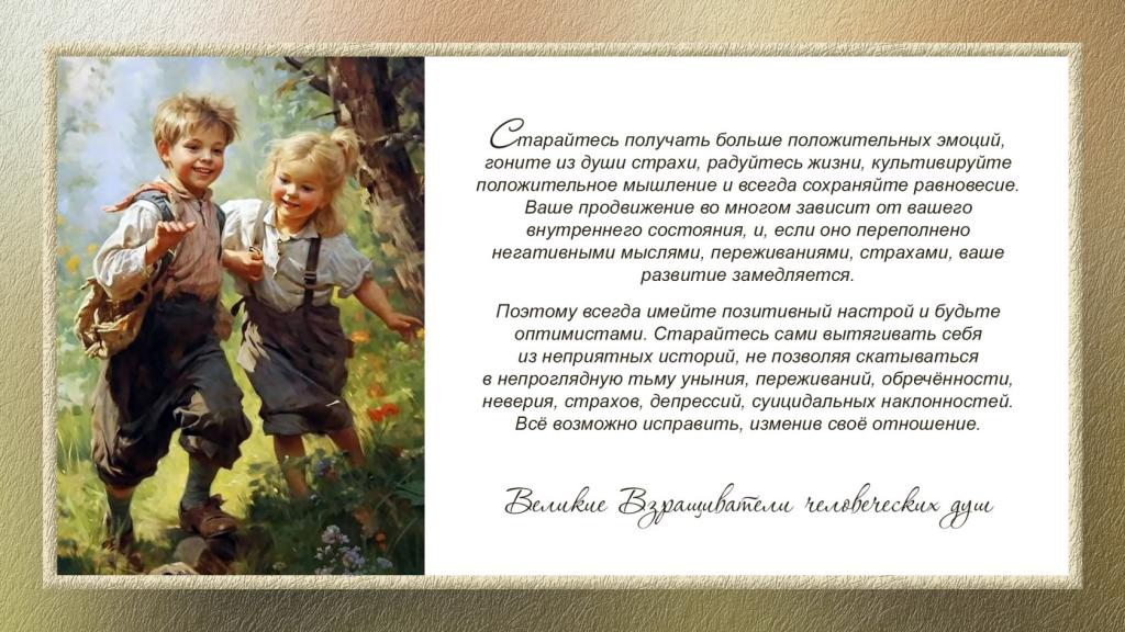 Поэтому всегда имейте позитивный настрой и будьте оптимистами. Старайтесь сами вытягивать себя из неприятных историй, не позволяя скатываться в непроглядную тьму уныния, переживаний, обречённости, неверия, страхов, депрессий, суицидальных наклонностей. Всё возможно исправить, изменив своё отношение.