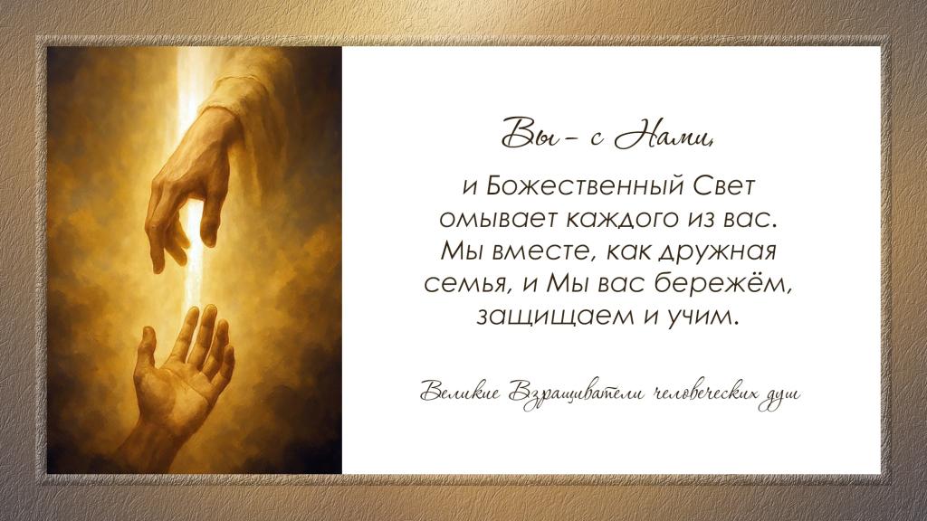 Мы очень рады нашей новой встрече, когда вы снова имеете шанс получить Божественную энергию. Вы – с Нами, и Божественный Свет омывает каждого из вас. Мы вместе, как дружная семья, и Мы вас бережём, защищаем и учим.