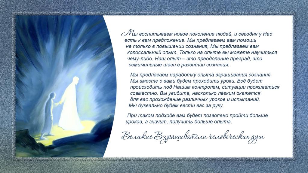 Мы предлагаем наработку опыта взращивания сознания. Мы вместе с вами будем проходить уроки. Всё будет происходить под Нашим контролем, ситуации проживаться совместно. Вы увидите, насколько лёгким окажется для вас прохождение различных уроков и испытаний. Мы буквально будем вести вас за руку.