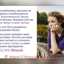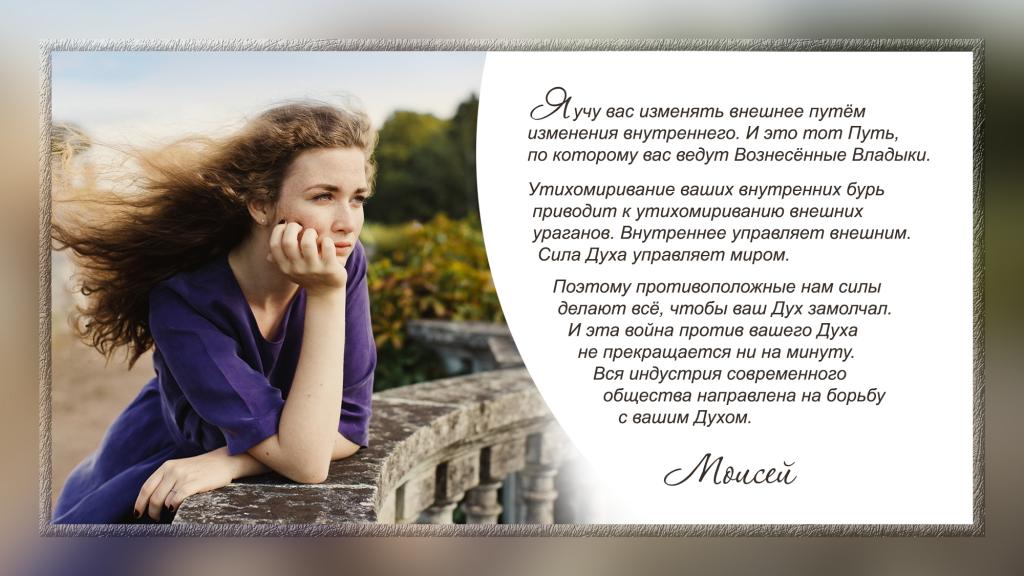 Не нужно, возлюбленные, выходить на улицу и кричать о необходимости следовать Божественному Закону. Нет, это не путь Владык. Владыки учат вас о следовании Закону в своих сердцах. Поэтому этот Путь называется Внутренним Путём.