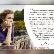 Внешнее послушно повторяет ваше внутреннее состояние. Поэтому вся ваша забота должна состоять в следовании Закону Бога в своих сердцах, в своём внутреннем пространстве.