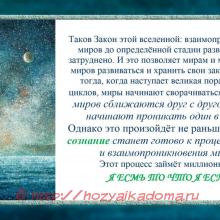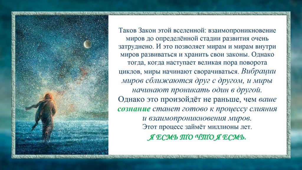 Таков Закон этой вселенной: взаимопроникновение миров до определённой стадии развития очень затруднено. И это позволяет мирам и мирам внутри миров развиваться и хранить свои законы. Однако тогда, когда наступает великая пора поворота циклов, миры начинают сворачиваться. Вибрации миров сближаются друг с другом, и миры начинают проникать один в другой.