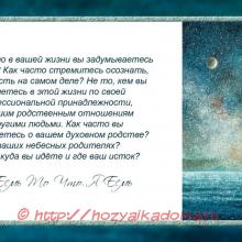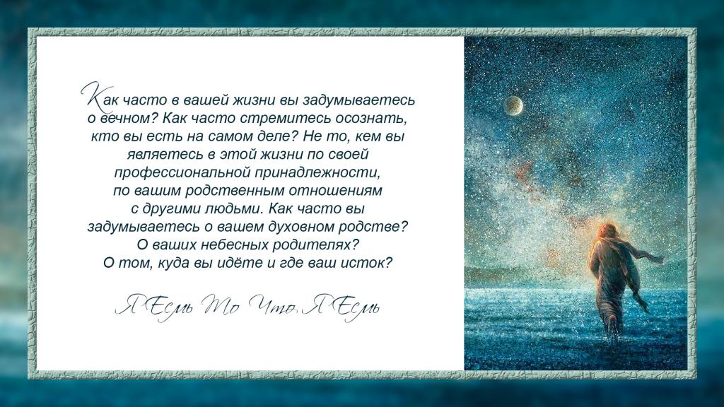 Как часто в вашей жизни вы задумываетесь о вечном? Как часто стремитесь осознать, кто вы есть на самом деле? Не то, кем вы являетесь в этой жизни по своей профессиональной принадлежности, по вашим родственным отношениям с другими людьми. Как часто вы задумываетесь о вашем духовном родстве? О ваших небесных родителях? О том, куда вы идёте и где ваш исток?