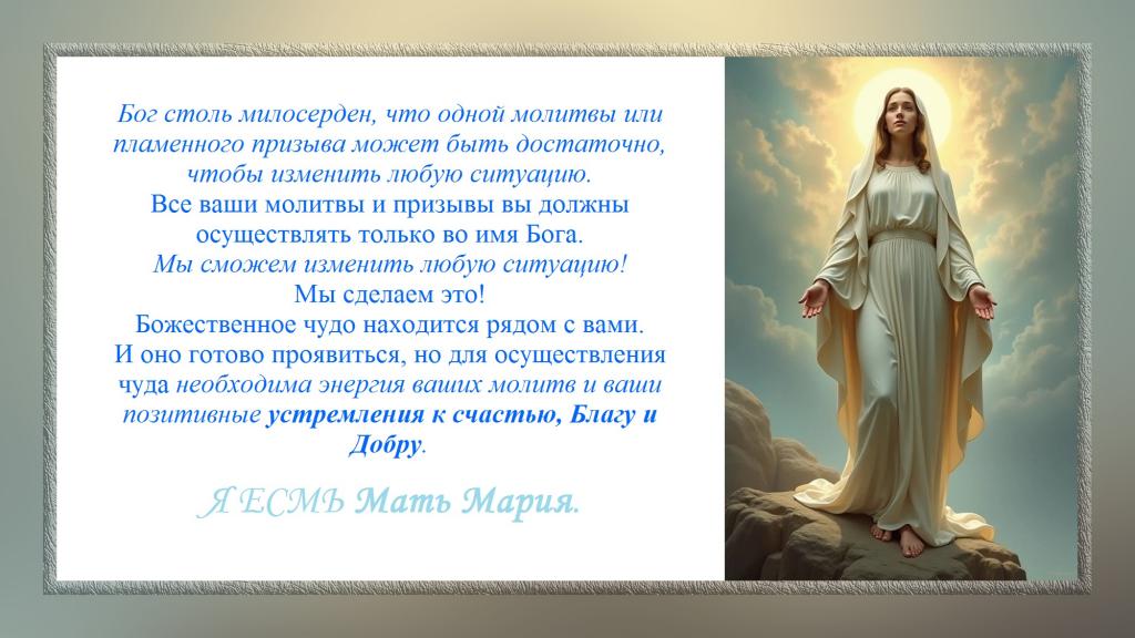 И оно готово проявиться, но для осуществления чуда необходима энергия ваших молитв и ваши позитивные устремления к счастью, Благу и Добру.