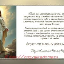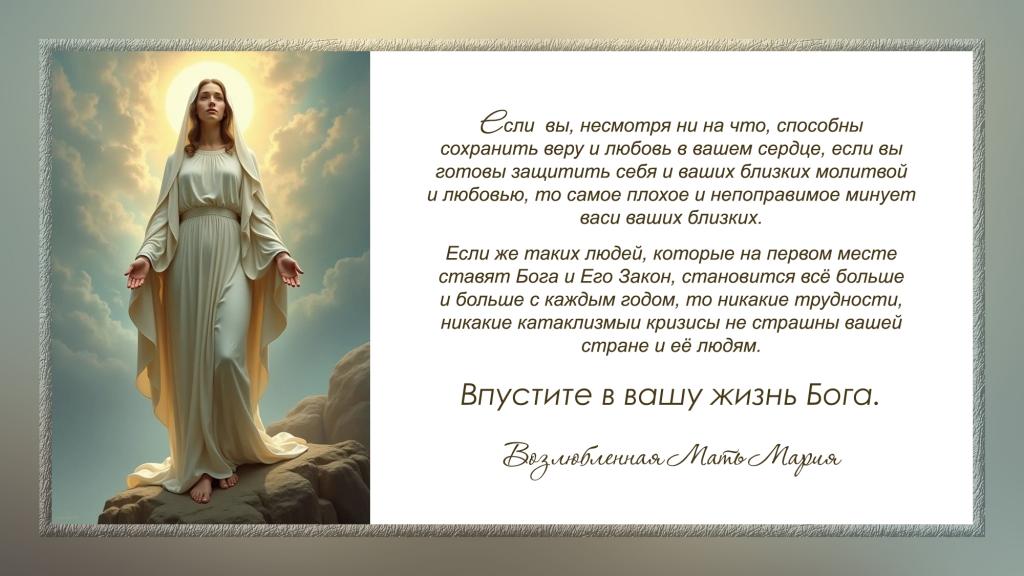 Если же вы, несмотря ни на что, способны сохранить веру и любовь в вашем сердце, если вы готовы защитить себя и ваших близких молитвой и любовью, то самое плохое и непоправимое минует вас и ваших близких. Если же таких людей, которые на первом месте ставят Бога и Его Закон, становится всё больше и больше с каждым годом, то никакие трудности, никакие катаклизмы и кризисы не страшны вашей стране и её людям.