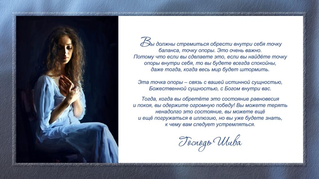 Это – истинное состояние, которое поможет вам справиться с любыми трудностями и испытаниями. Вы должны стремиться обрести внутри себя точку баланса, точку опоры. Это очень важно. Потому что если вы сделаете это, если вы найдёте точку опоры внутри себя, то вы будете всегда спокойны, даже тогда, когда весь мир будет штормить.