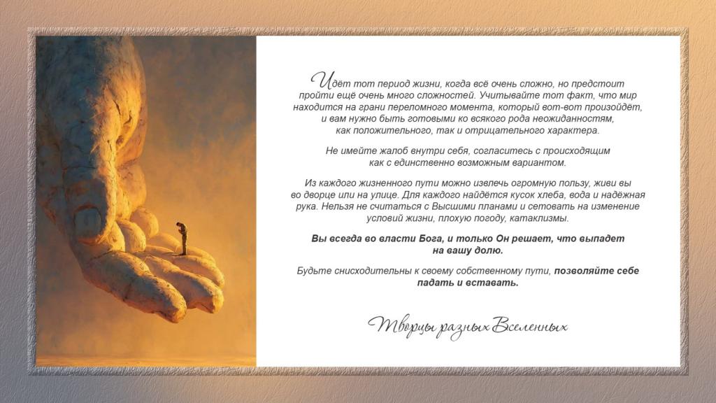 Великие перемены влекут за собой ужесточение многих параметров жизни. И вам приходится преодолевать препятствия и заслоны. Жизнь полна большими и малыми испытаниями различного характера во всех сферах жизни. А вам необходимо пройти свой путь виртуозно, не только не расплескав свой сосуд, но и приумножив его содержимое. В таких условиях вы имеете больше возможностей для повышения сознания. Ваше сопротивление предлагаемым условиям должно быть минимальным, ибо всё делается вам во благо. Независимо от того, что происходит в мире, вам надлежит проходить индивидуальные уроки в соответствии со своей личной программой.