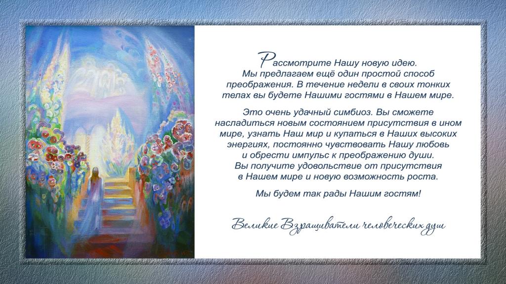 Теперь Мы можем совершенствовать Наши методы. Рассмотрите Нашу новую идею. Мы предлагаем ещё один простой способ преображения. В течение недели в своих тонких телах вы будете Нашими гостями в Нашем мире.