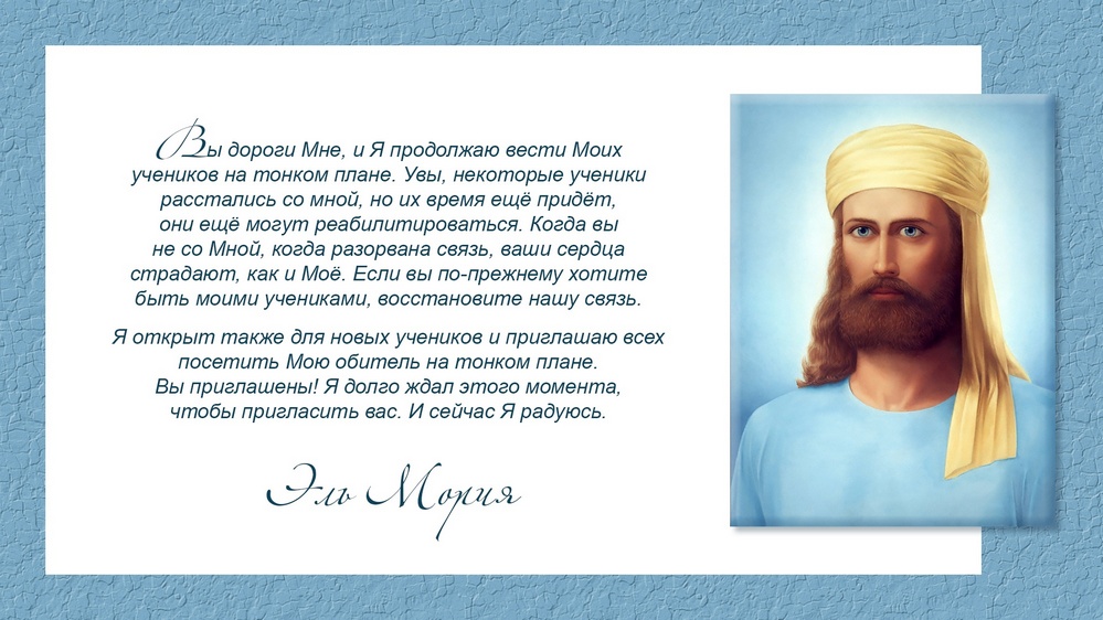 Я открыт также для новых учеников и приглашаю всех посетить Мою обитель на тонком плане. Вы приглашены! Я долго ждал этого момента, чтобы пригласить вас. И сейчас Я радуюсь.