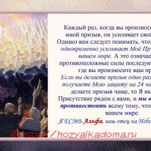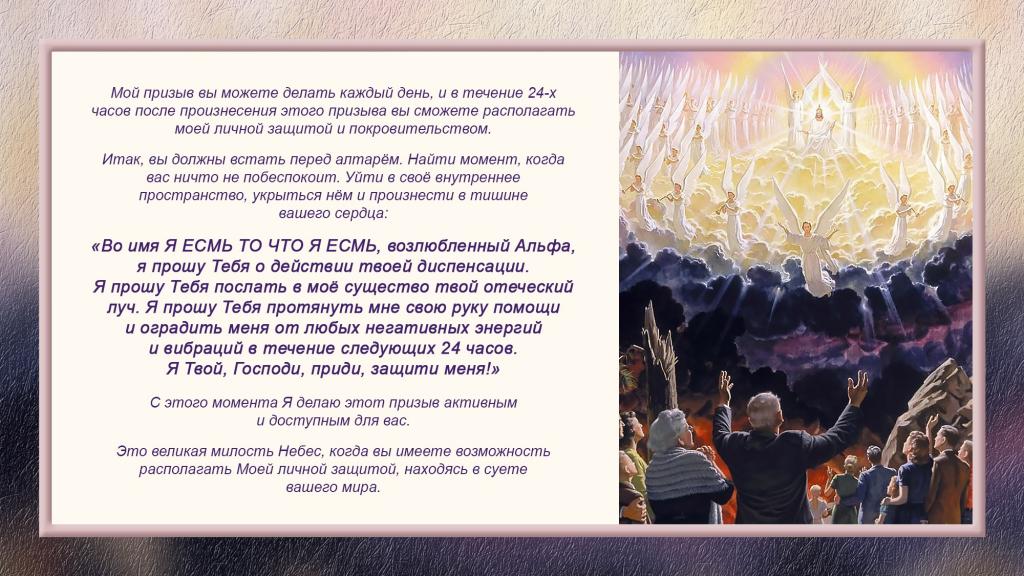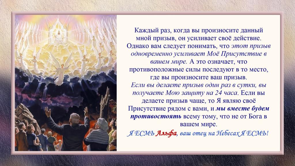 Если вы делаете призыв один раз в сутки, вы получаете Мою защиту на 24 часа. Если вы делаете призыв чаще, то Я являю своё Присутствие рядом с вами, и мы вместе будем противостоять всему тому, что не от Бога в вашем мире.