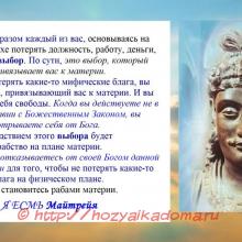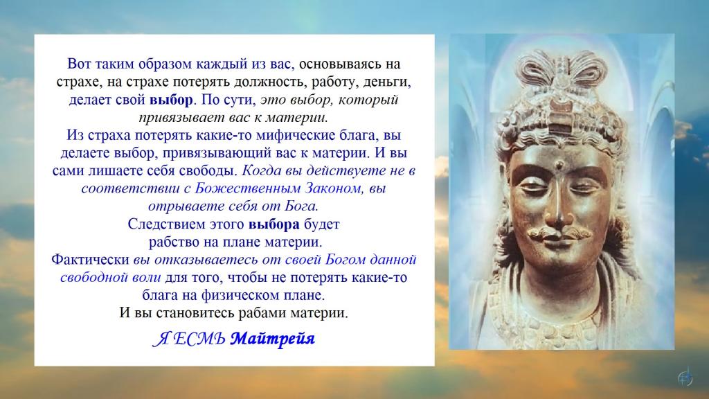 Вот таким образом каждый из вас, основываясь на страхе, на страхе потерять должность, работу, деньги, делает свой выбор. По сути, это выбор, который привязывает вас к материи. Из страха потерять какие-то мифические блага, вы делаете выбор, привязывающий вас к материи. И вы сами лишаете себя свободы. Когда вы действуете не в соответствии с Божественным Законом, вы отрываете себя от Бога.