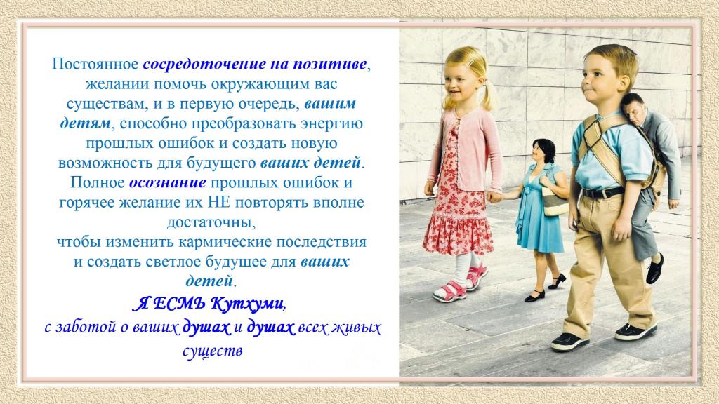 Постоянное сосредоточение на позитиве, желании помочь окружающим вас существам, и в первую очередь, вашим детям, способно преобразовать энергию прошлых ошибок и создать новую возможность для будущего ваших детей.