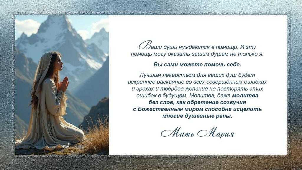 Молитва, даже молитва без слов, как обретение созвучия с Божественным миром способна исцелить многие душевные раны.