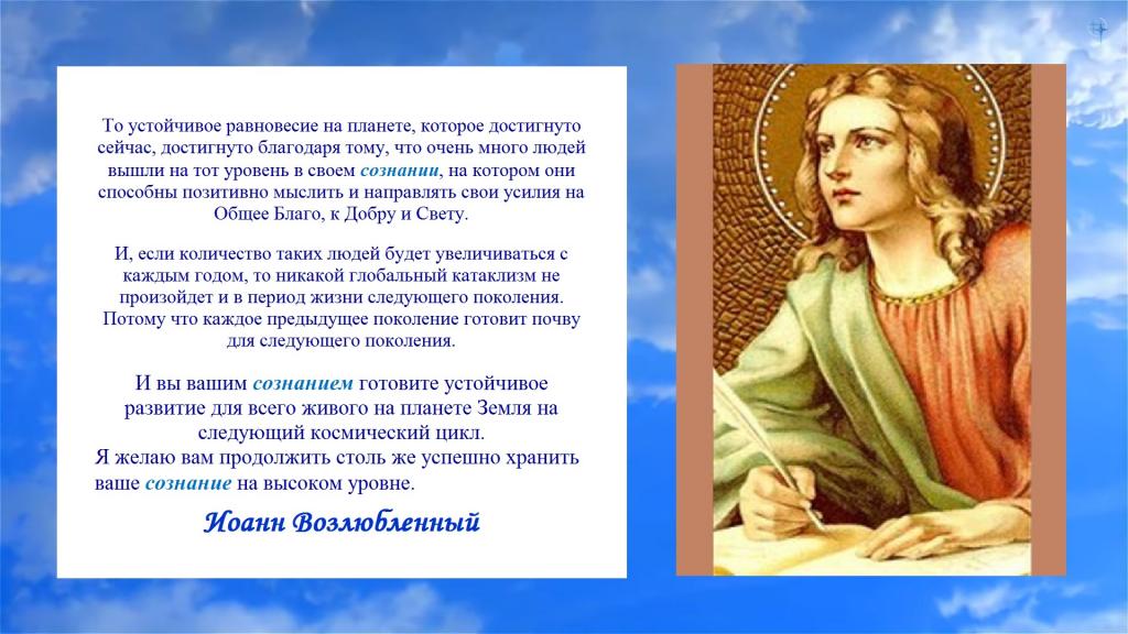 То устойчивое равновесие на планете, которое достигнуто сейчас, достигнуто благодаря тому, что очень много людей вышли на тот уровень в своем сознании, на котором они способны позитивно мыслить и направлять свои усилия на Общее Благо, к Добру и Свету.