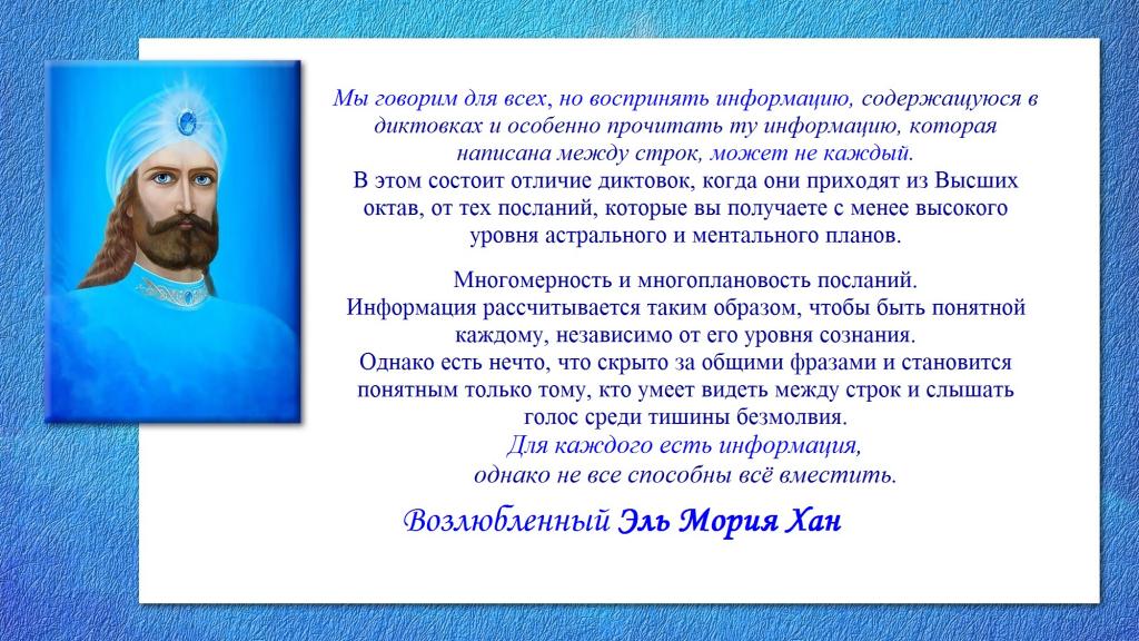 Однако когда-нибудь вы вспомните, что читали эти диктовки Вознесённых Владык и неосознанно получали информацию, содержащуюся между строк.