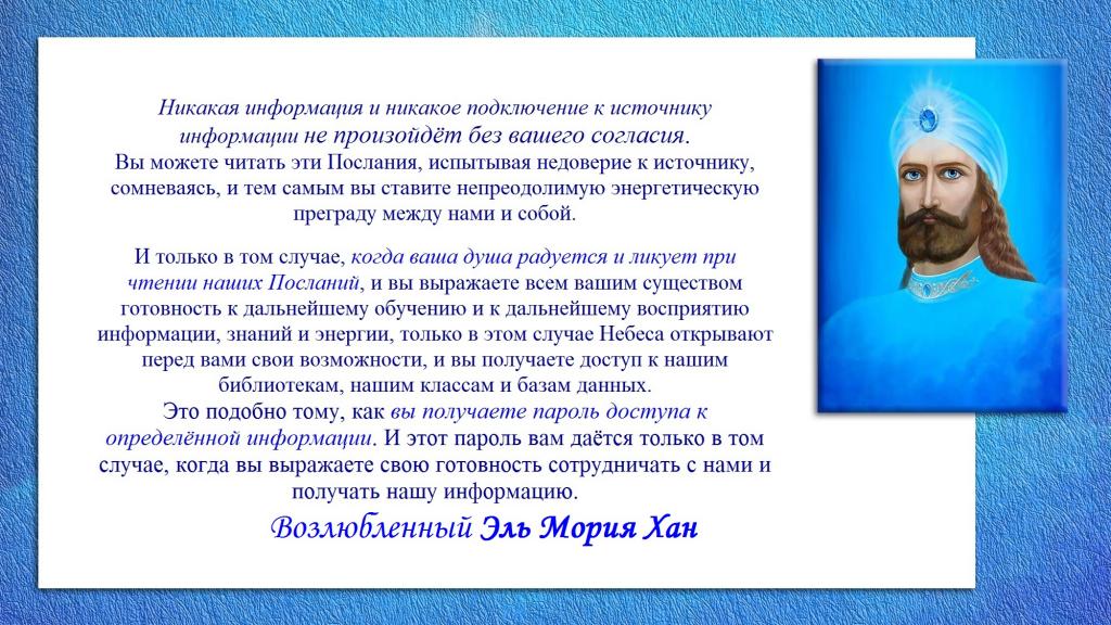 И только в том случае, когда ваша душа радуется и ликует при чтении наших Посланий, и вы выражаете всем вашим существом готовность к дальнейшему обучению и к дальнейшему восприятию информации, знаний и энергии, только в этом случае Небеса открывают перед вами свои возможности, и вы получаете доступ к нашим библиотекам, нашим классам и базам данных.