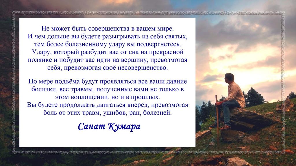 И чем дольше вы будете разыгрывать из себя святых, тем более болезненному удару вы подвергнетесь. Удару, который разбудит вас от сна на прекрасной полянке и побудит вас идти на вершину, превозмогая себя, превозмогая своё несовершенство.