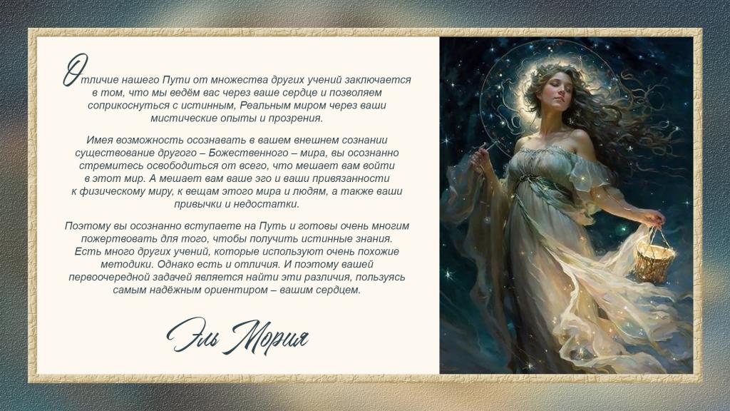 Отличие нашего Пути от множества других учений заключается в том, что мы ведём вас через ваше сердце и позволяем соприкоснуться с истинным, Реальным миром через ваши мистические опыты и прозрения.