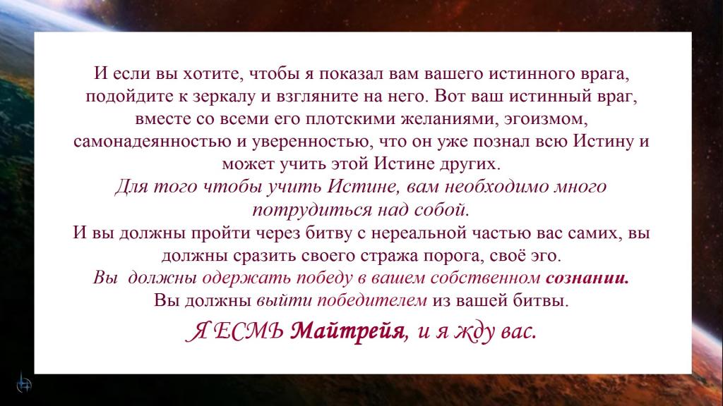 И если этот человек причиняет вам вред, оскорбляет вас, вы не должны воспринимать этого человека как вашего личного врага или падшего ангела. Он пришёл к вам либо для того, чтобы вы могли вернуть ему свой кармический долг, либо он пришёл к вам для того, чтобы дать вам урок. Проверить насколько вы усвоили урок, полученный вами от нас через наше Учение.