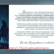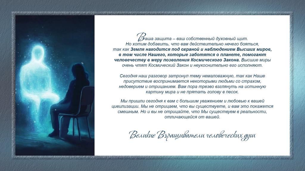 Ваша защита – ваш собственный духовный щит. Но хотим добавить, что вам действительно нечего бояться, так как Земля находится под охраной и наблюдением Высших миров, в том числе Нашего, которые заботятся о планете, помогают человечеству в меру позволения Космического Закона. Высшие миры очень чтят Космический Закон и неукоснительно его исполняют.