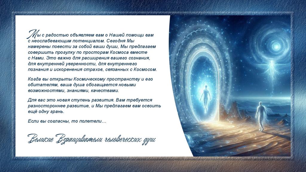 Мы с радостью объявляем вам о Нашей помощи вам с неослабевающим потенциалом. Сегодня Мы намерены повести за собой ваши души, Мы предлагаем совершить прогулку по просторам Космоса вместе с Нами. Это важно для расширения вашего сознания, для внутренней уверенности, для внутреннего познания и искоренения страхов, связанных с Космосом.