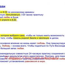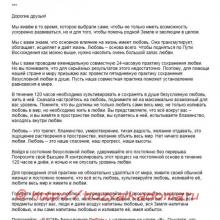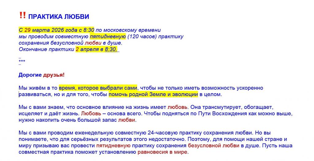 Мы с вами проводим еженедельную совместную 24-часовую практику сохранения любви. Но вы понимаете, что для серьёзных результатов этого недостаточно. Поэтому, для помощи нашей стране и миру призываю вас провести пятидневную практику сохранения безусловной любви в душе. Пусть наша совместная практика поможет установлению равновесия в мире.