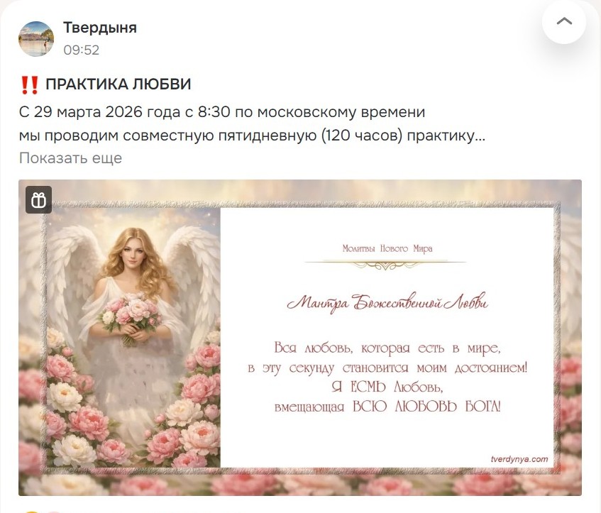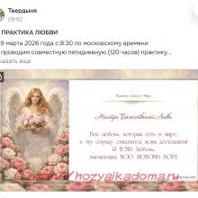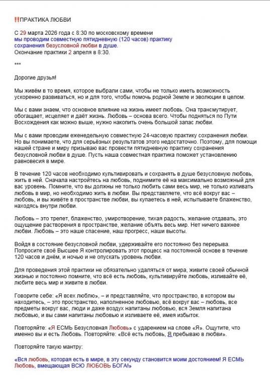 Мы с вами проводим еженедельную совместную 24-часовую практику сохранения любви. Но вы понимаете, что для серьёзных результатов этого недостаточно. Поэтому, для помощи нашей стране и миру призываю вас провести пятидневную практику сохранения безусловной любви в душе. Пусть наша совместная практика поможет установлению равновесия в мире.