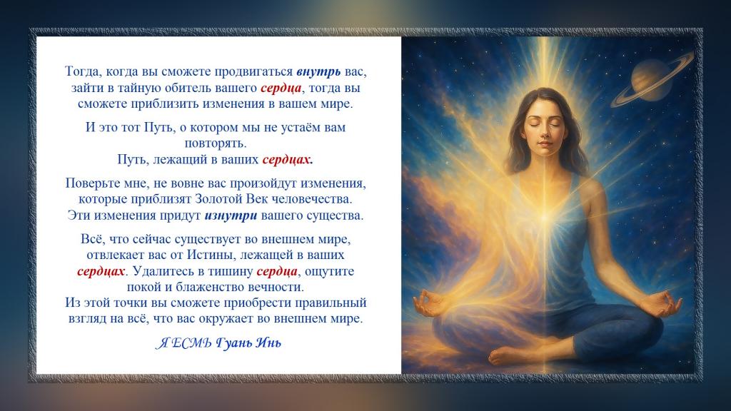 Тогда, когда вы сможете продвигаться внутрь вас, зайти в тайную обитель вашего сердца, тогда вы сможете приблизить изменения в вашем мире.